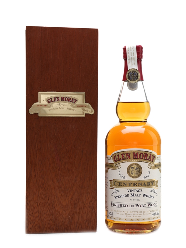 A bottle of Glen Moray released for the distillery's Centenary, and presented in a wooden box. Four casks were selected from the 1976, 1977, 1978, and 1979 vintages. The ex-bourbon casks were left to mature until 1987 when the whisky was transferred to port casks from the Douro valley.
