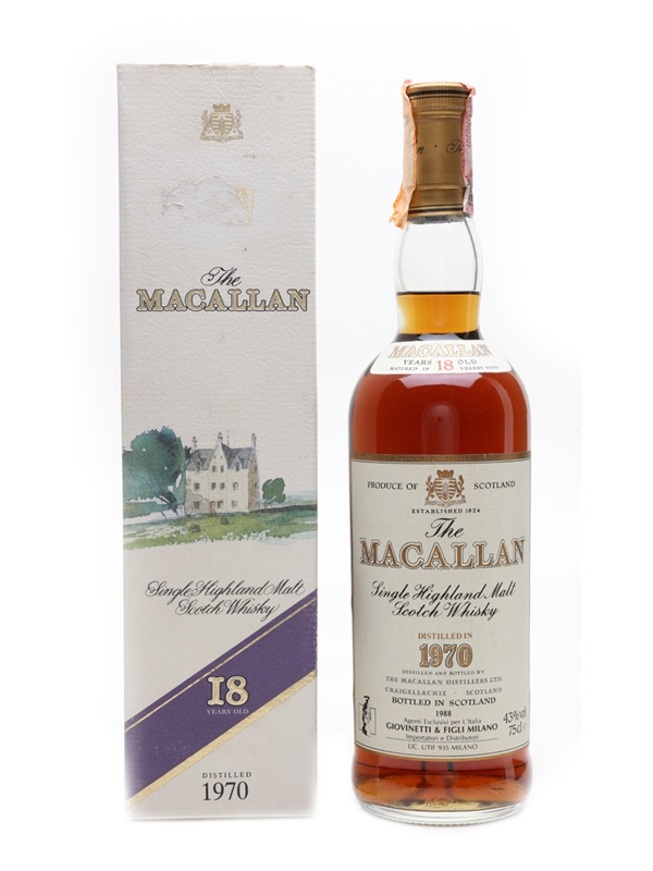 A bottle of The Macallan 18 Year Old, distilled in 1970 and bottled in 1988. This was bottled for the Italian market and imported by Giovinetti & Figli.