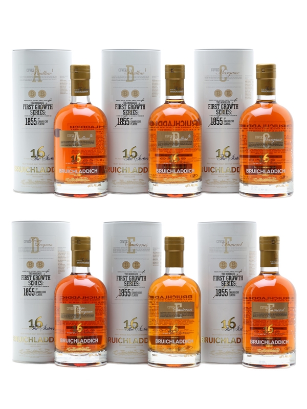 A collection of six individual Bruichladdich 16 Year Old Cuvées, each benefiting from additional cask evolution in the best French oak, from one of the very greatest Bordeaux châteaux.
