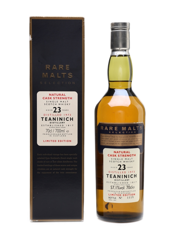 A bottle of Teaninich 1973, bottled for the Rare Malts selection in April 1997. The Rare Malts were a series of cask strength whiskies first released in 1995 by DCL (later to become part of Diageo).