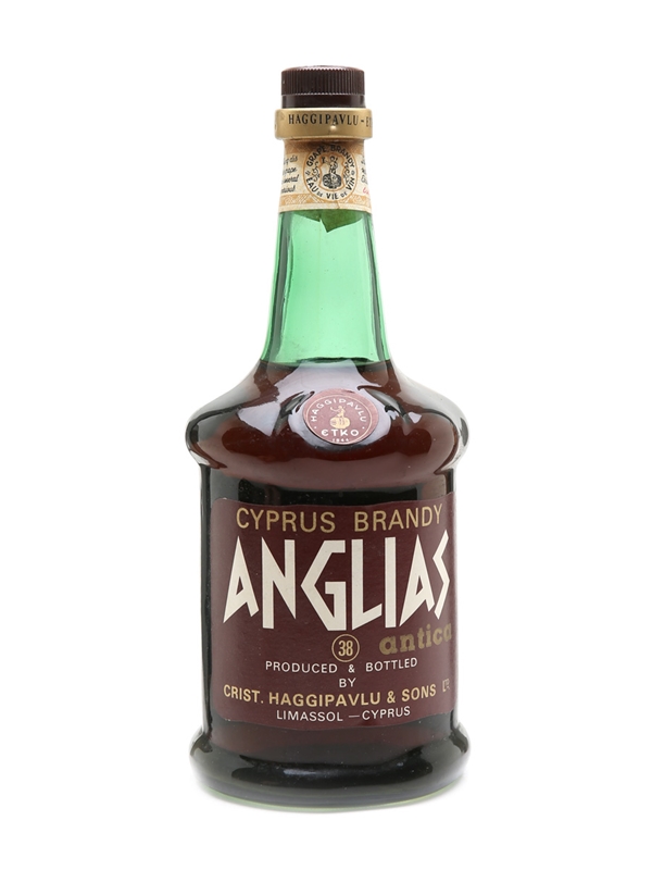 A bottle of Haggipavlu Anglias brandy from Cyprus. We estimate this was bottled in the 1970s.