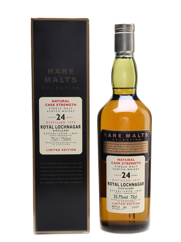 A bottle of Royal Lochnagar 24 Year Old. This was distilled in 1972 and bottled in September 1997 for Diageo's Rare Malts Selection.