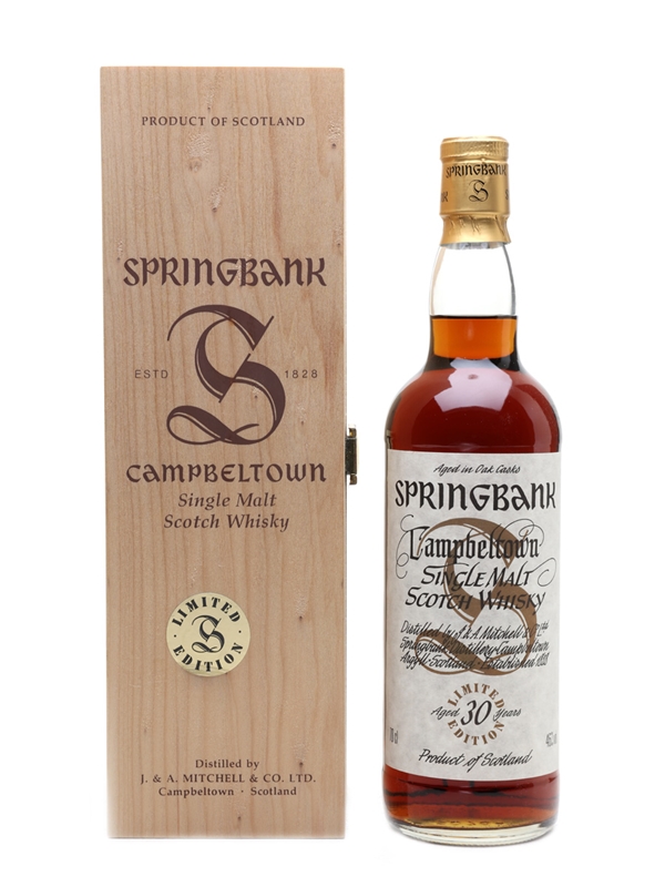 A bottle of Springbank 30 Year Old, released in March 1999 as the second installment of the distillery's Millennium set.