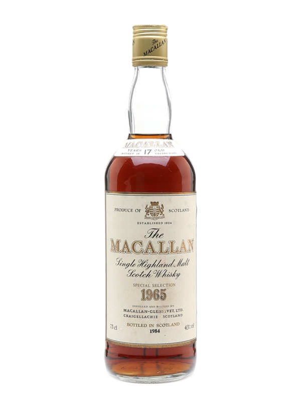 A bottle of The Macallan 17 Year Old. This was distilled in 1965, matured in sherry casks, and bottled in 1984.