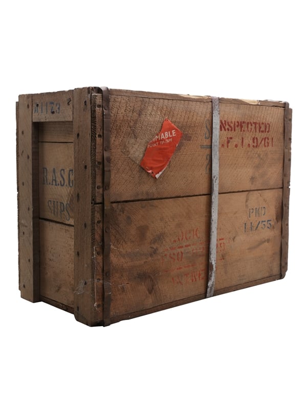 A pair of Royal Navy Rum flagons, still in their original wooden crate. The crate is sealed with metal straps. We estimate these were bottled in 1954 to 1955.