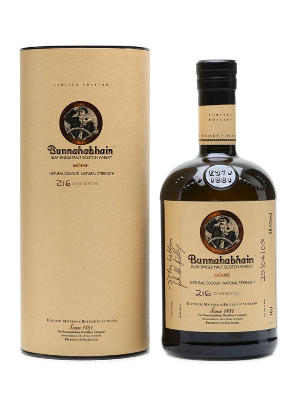 A bottle of limited edition Bunnahabhain Moine, distilled in 2003 and finished in Oloroso Sherry butts for three months before bottling for Feis Ile 2009.