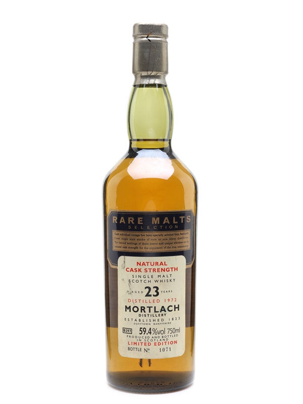 A bottle of Mortlach 23 Year Old. This was distilled in 1972 and bottled for Diageo's now-discontinued Rare Malts Selection. This bottle was released in 1996, the year the distillery underwent a £1.5 million renovation, 32 years after the last refurbishment.