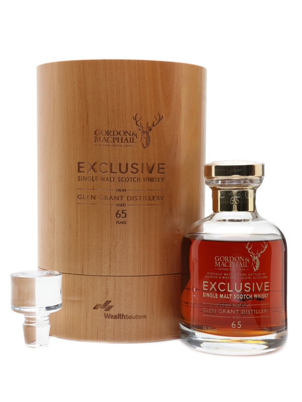 A bottle of Glen Grant 65 Year Old, exclusively bottled for Polish company Wealth Solutions. This was distilled in 1950, matured in a single American white oak cask (which was likely first used to transport sherry to the UK), and bottled on 14 October 2015 by Gordon & MacPhail. This is presented in a numbered decanter with stopper, and a round wooden box. The booklet details the history of Glen Grant distillery, as well as independent bottler Gordon & MacPhail and Wealth Solutions.
