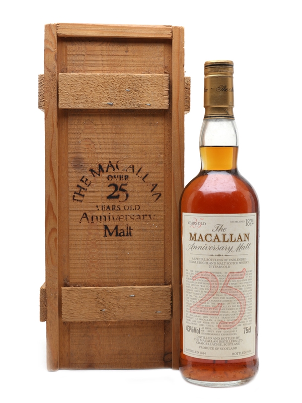 A bottle of The Macallan 25 Year Old, distilled in 1964 and matured in sherry casks before bottling in 1989 as part of the Anniversary Malt series.