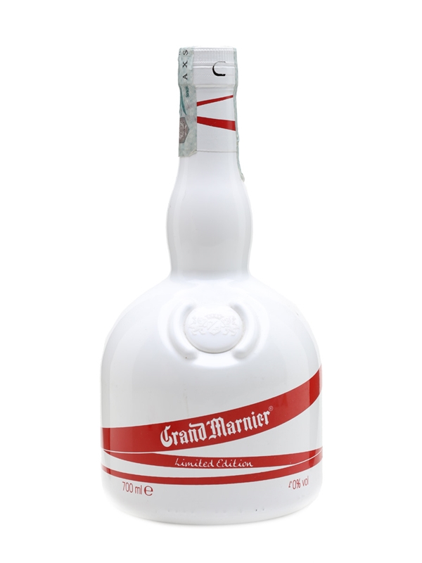 A limited edition bottle of Grand Marnier orange liqueur, presented in an white opaque bottle.