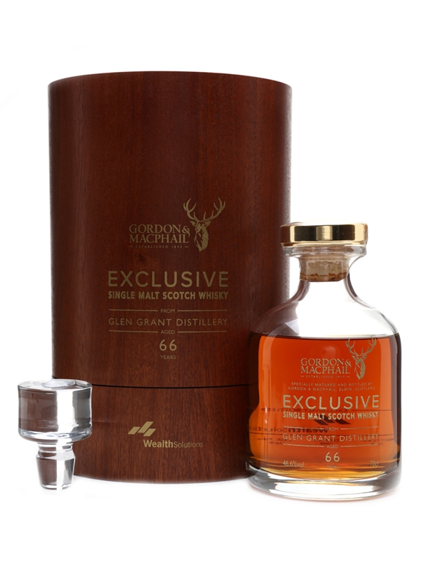 A bottle of Glen Grant 66 Year Old, exclusively bottled for Polish investment company Wealth Solutions. This was distilled in 1948, matured in a single American white oak cask (which was first used to transport sherry to the UK), and bottled on 14 April 2014 by Gordon & MacPhail. This is presented in a numbered decanter with stopper, and a round wooden box. The booklet details the history of Glen Grant distillery, as well as independent bottler Gordon & MacPhail and Wealth Solutions.