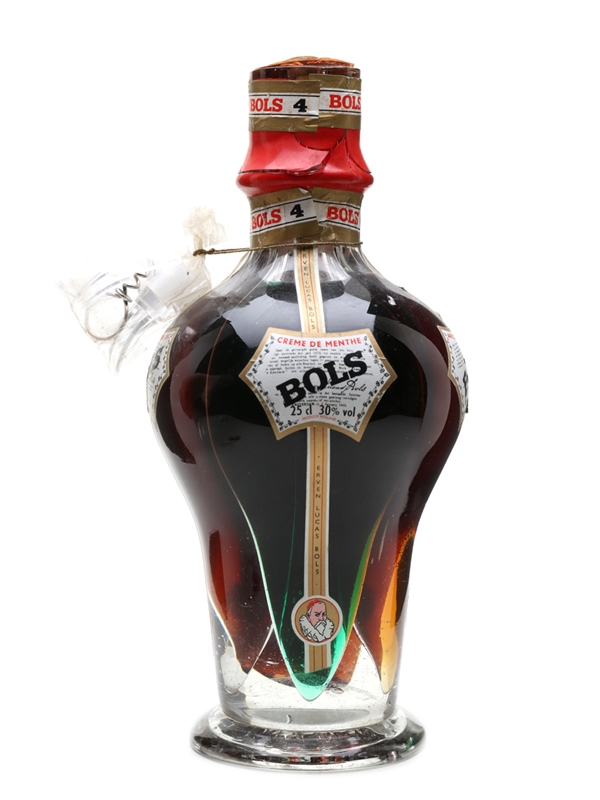 An intriguing old four-part bottle of liqueur from Dutch producer Bols. Each compartment contains approximately 25cl of a different liqueur: Cherry Brandy, Curacao Triple Sec, Peppermint, and Apricot Brandy.