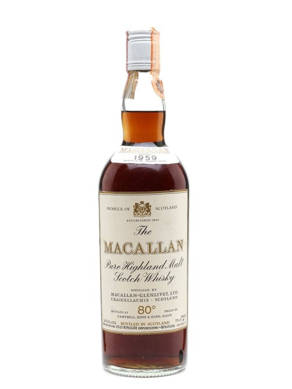 A bottle of The Macallan 1959, bottled by Campbell, Hope & King. This was imported for the Italian market by Rinaldi, we estimate in the 1970s.