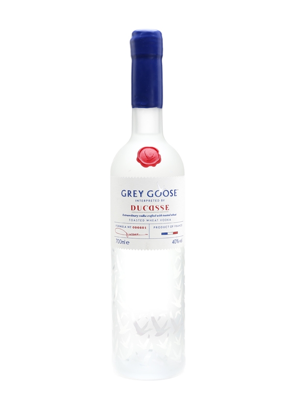 A bottle of Grey Goose vodka from France, made from toasted wheat. This is a collaboration by Grey Goose Maitre de Chai Francois Thibault, and world renowned chef Alain Ducasse.