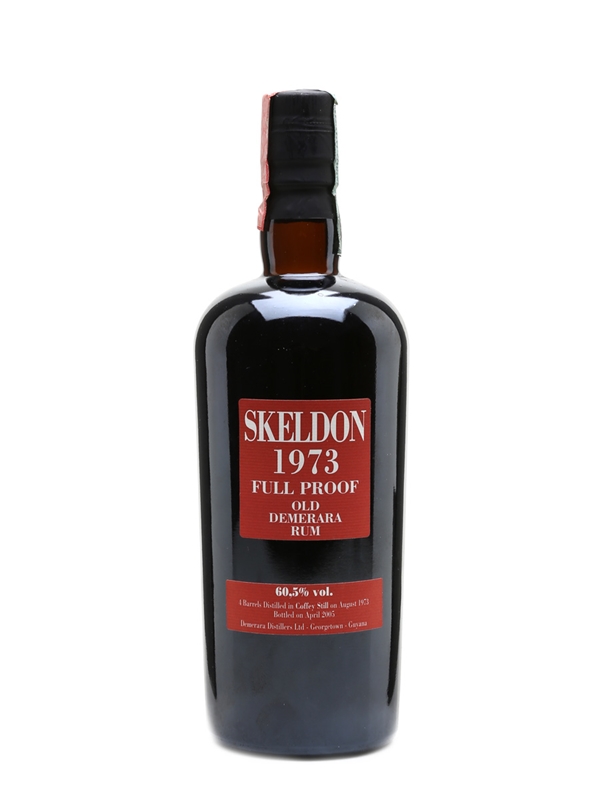 A bottle of Skeldon 32 Year Old Full Proof Demerara rum. This was distilled in a Coffey still in August 1973, matured fully in tropical weather, and bottled from four barrels in April 2005.