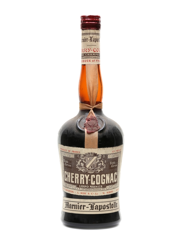 A bottle of Cherry Cognac, a liqueur from Marnier Lapostolle, the producer of Grand Marnier. On its release, this liqueur was originally called 'Cherry Brandy', then 'Cherry Cognac', then 'Cherry Marnier' from 1966 onwards. This was imported to the UK by L Rose & Co. Ltd., St Albans. We estimate this was bottled in the early 1960s.