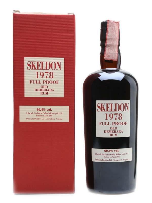A bottle of Skeldon 27 Year Old Full Proof Demerara rum. This was distilled in a Coffey still in April 1978, matured fully in tropical weather, and bottled from three barrels in April 2005.