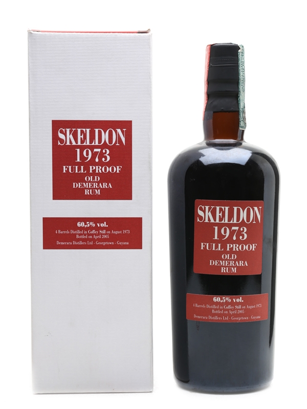 A bottle of Skeldon 32 Year Old Full Proof Demerara rum. This was distilled in a Coffey still in August 1973, matured fully in tropical weather, and bottled from four barrels in April 2005.