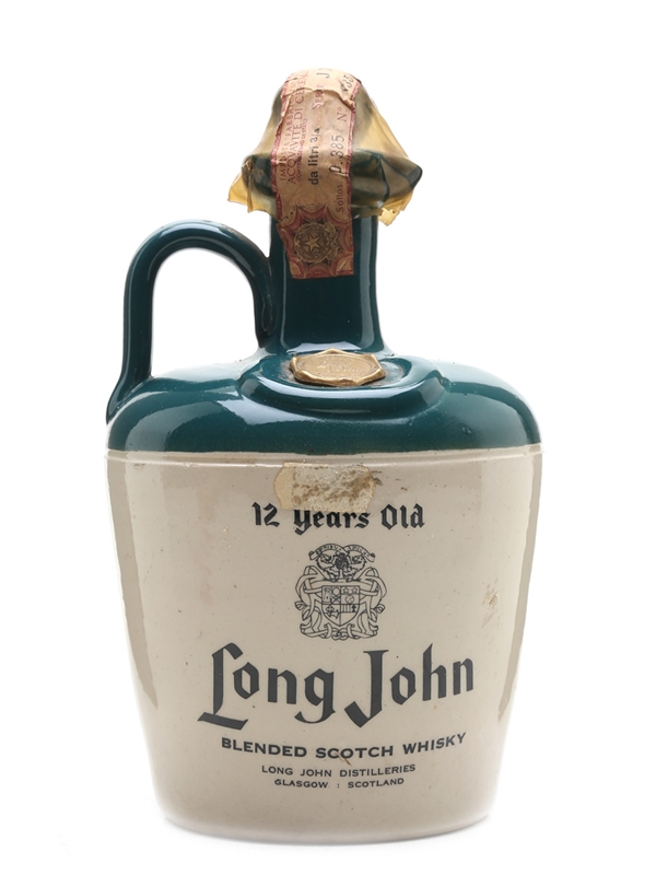 A bottle of Long John 12 Year Old blended Scotch whisky presented in a ceramic jug. This was imported to Italy by Stock, we estimate in the 1970s.