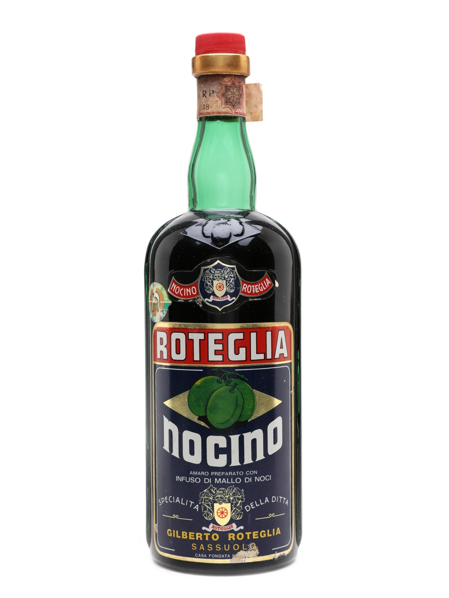 A litre bottle of Nocino Roteglia a plum flavored liqueur from Italy. We estimate this was bottled in the 1960s.