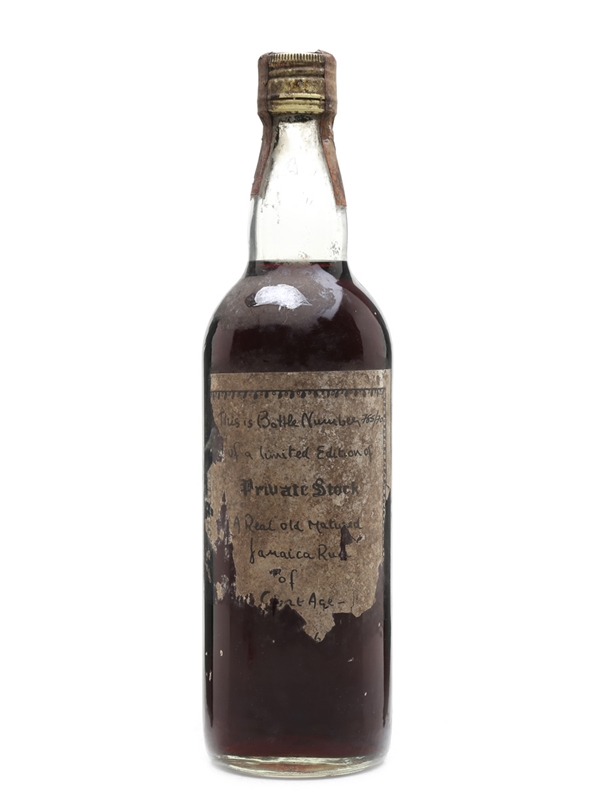 A bottle of Wray & Nephew Private Stock Jamaica rum. The label reads: This is bottle number 785/70 of a limited edition of Private Stock. A real old matured Jamaica Rum of great age - . The label is missing below this point. It is also missing the Soffiantino & Co. importer's label.