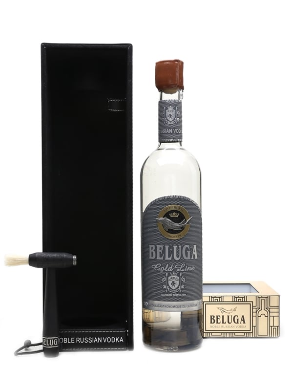 A bottle of Beluga Gold Line Russian vodka from Mariinsk distillery. This premium vodka comes in a leather box, with a small hammer and brush for removing the wax seal. It also includes a light up base for displaying the bottle.