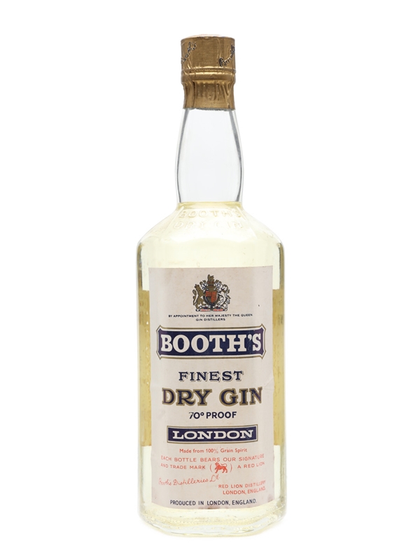 An old bottling of Booth's London Dry Gin. The back label carries certification from the Royal Institute of Public Health & Hygiene dated 1964, which leads us to estimate this bottle dates from the 1960s.