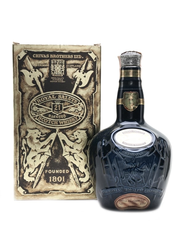 A bottle of Chivas Brothers' Royal Salute 21 Year Old presented in a blue Wade decanter.