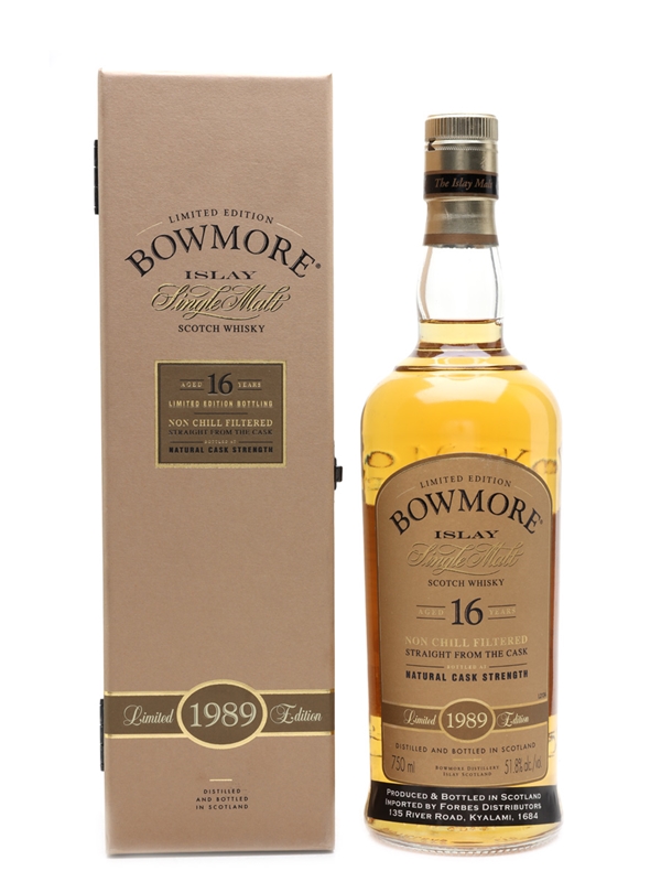 A limited edition bottle of Bowmore 16 Year Old. This was distilled in 1989 and matured in selected casks, predominantly bourbon, before bottling at cask strength. This was imported to South Africa by Forbes Distributors.