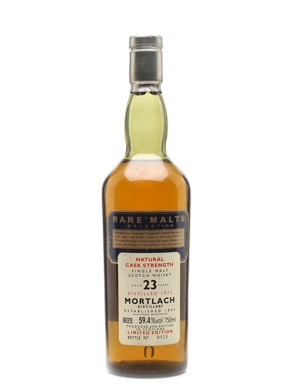 A bottle of Mortlach 23 Year Old. This was distilled in 1972 and bottled for Diageo's now-discontinued Rare Malts Selection. This bottle was released in 1996, the year the distillery underwent a £1.5 million renovation, 32 years after the last refurbishment.