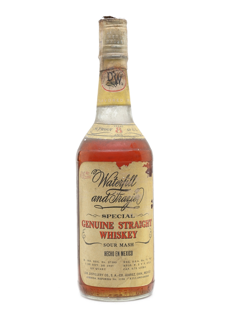 A bottle of Waterfill and Frazier 8 Year Old Sour Mash whiskey, made in Mexico to a genuine American recipe. We estimate this was bottled in the 1980s.