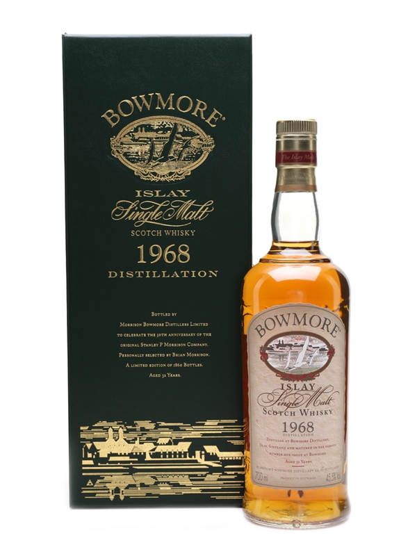 A bottle of Bowmore 32 Year Old. This was distilled in 1968 and bottled to celebrate the 50th anniversary of The Stanley P Morrison company, owners of Bowmore since 1963.