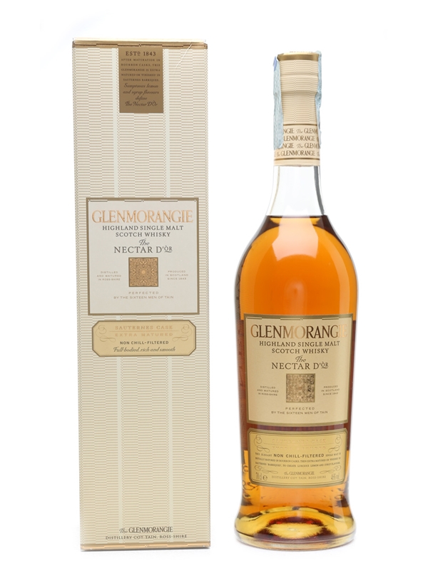 A bottle of Glenmorangie Nectar d'Or. This was matured first in bourbon casks, before transferring to Sauternes wine barriques for extra aging.