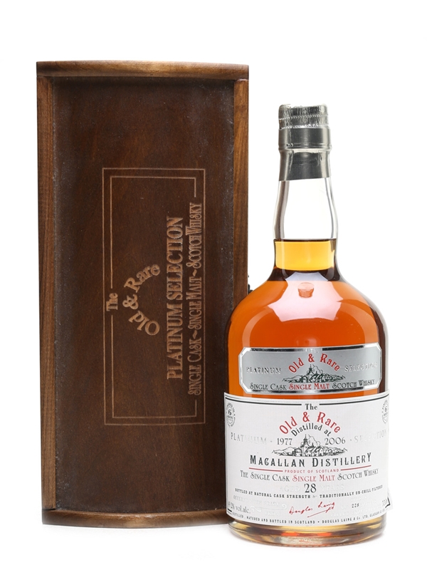 A bottle of Macallan 28 Year Old, distilled in 1977 and bottled from a single cask in 2006 for Douglas Laing's Old & Rare Platinum Selection series. This whisky underwent six months' finishing in sherry casks before bottling.