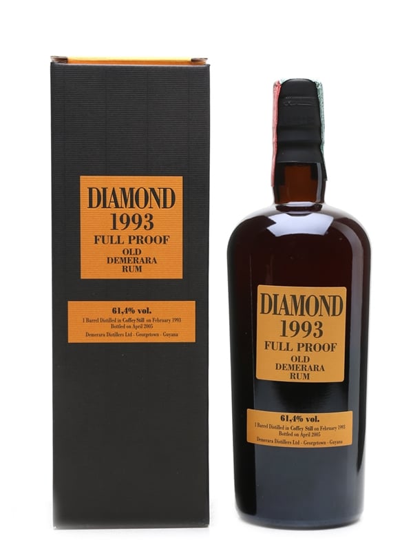 A bottle of Diamond 12 Year Old Full Proof Demerara Rum. This was distilled in February 1993 in a Coffey still, fully matured in the tropics and bottled in April 2005 by Italian bottler Velier.