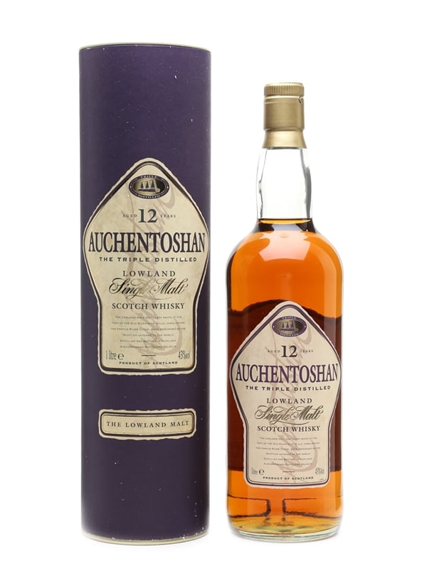 A litre bottle of Auchentoshan 12 Year Old, a triple distilled Lowland single malt. This is the old presentation in a round tube.