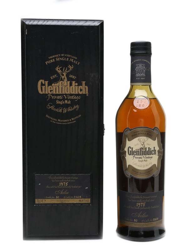 A bottle of Glenfiddich 1975 Private Vintage. This whisky was exclusively bottled for the Aelia travel retailer.