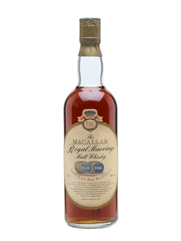 A very rare bottle of Macallan released in 1981 to commemorate the marriage of Prince Charles and Lady Diana Spencer.