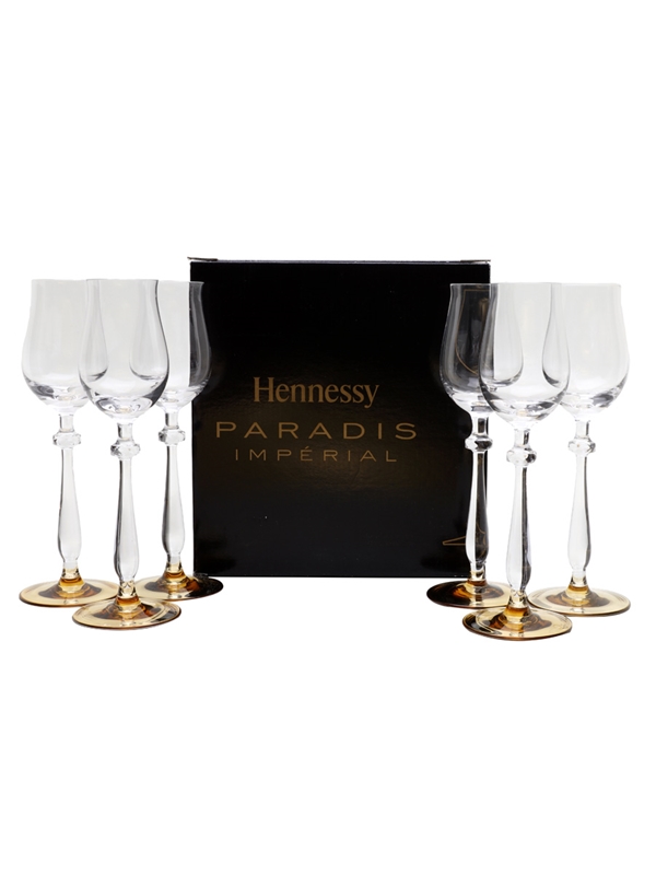 A set of six hand-blown, crystal glasses from Hennessy, developed in collaboration with designer Sam Baron specifically for the Paradis Impérial Cognac.