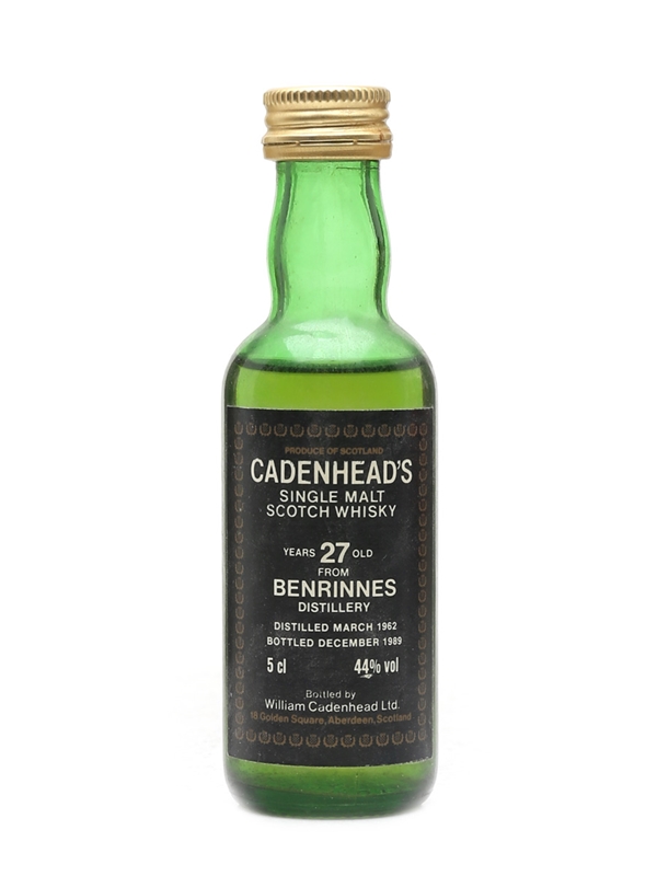 A miniature bottle of Benrinnes 27 Year Old Single Malt Scotch Whisky. This was distilled in March 1962, and bottled in December 1989 by Cadenhead's.