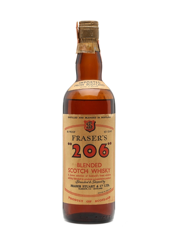 A bottle of Fraser's 206 Blended Scotch Whisky. Blended and shipped by Fraser Stuart & Co. Ltd.