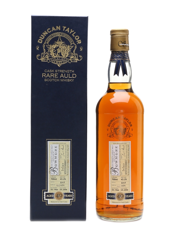 A bottle of Bowmore 40 Year Old distilled in May 1966, and bottled from a single cask in May 2006 by Duncan Taylor. This is presented in a wooden case.