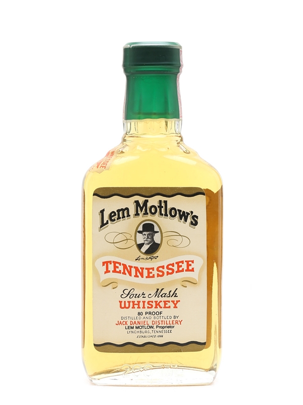 A 20cl bottle of Lem Motlow's Tennessee Sour Mash Whiskey, produced at Jack Daniel distillery.This 20cl bottling from 1984 features a 'twelve months old' age statement and has the original Tennessee tax strip.