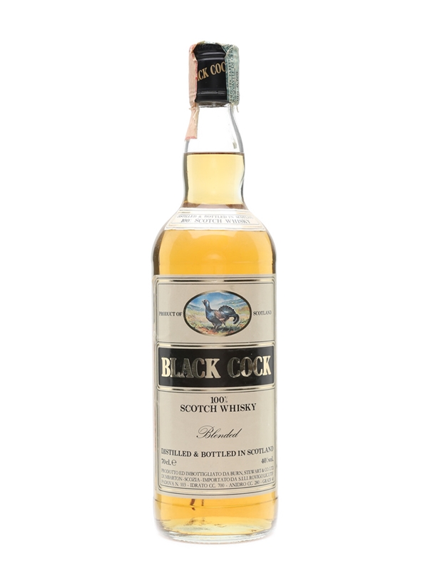 A bottle of Black Cock blended Scotch whisky. This was bottled by Stewart Burn & Co., and imported to Italy by Sili, we estimate in the 1990s.