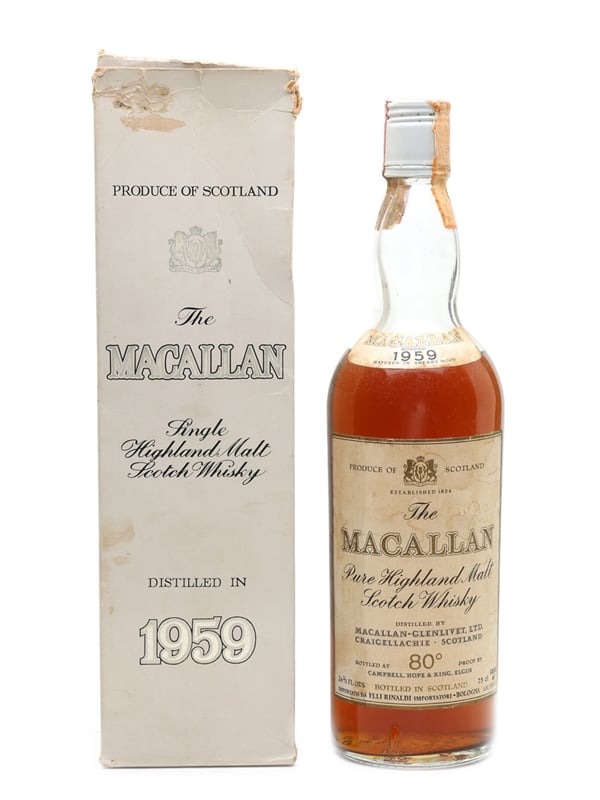 A bottle of The Macallan 1959, imported by Rinaldi for the Italian market. We estimate this was bottled in the 1970s.