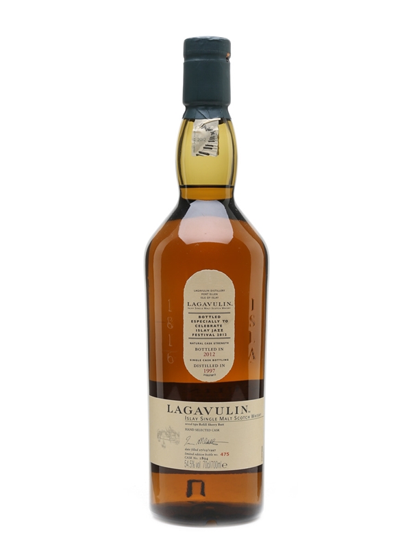 A bottle of Lagavulin distilled on 7 May 1997, matured in a refill sherry butt and bottled in 2012 for the Islay Jazz Festival.