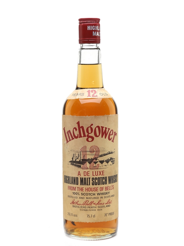 A bottle of Inchgower 12 Year Old, a De Luxe Highland Malt Scotch Whisky from the House of Bell's. We estimate this was bottled in the 1970s.