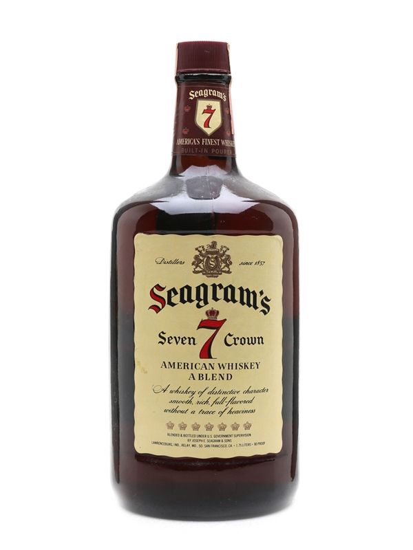 A 175cl bottle of Seagram's 7 Crown American blended whiskey. This bottle has a handle and a built in pourer for easy serving. We estimate this was bottled in the 1980s.