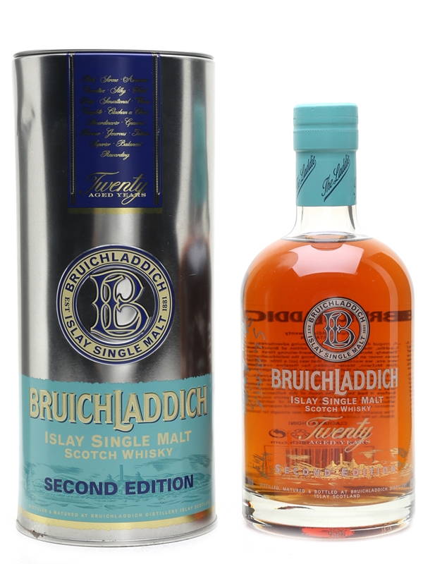 A bottle of Bruichladdich 20 year old. This second edition, nicknamed 'Flirtation', was first matured in ex-bourbon casks before transferring to Mourvedre wine casks from the south of France.
