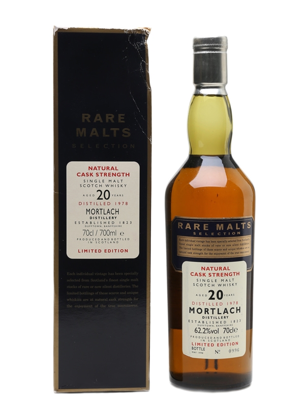 A bottle of Mortlach 20 Year Old. This was distilled in 1978 and bottled for Diageo's now-discontinued Rare Malts Selection in May 1998.
